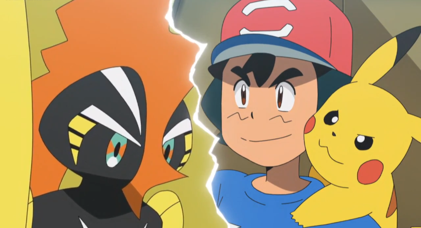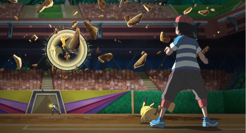 Kukui und Kapu-Riki beginnen mit dem Einsatz ihrer Z-Attacke Alolas Wächter. Durch diese öffnet sich die Erde und ein gewaltiger, gelb strahlender Erdtitan baut sich vor Ash und Pikachu auf, auf dessen Körper sich Kapu-Riki als Kopf platziert. Ash ist von diesem Schauspiel genauso beeindruckt wie seine Freunde und die anderen Zuschauer im Stadion. Gemeinsam feuern die anderen Schüler Ash an, der anschließend durch das Aufleuchten seines Z-Rings registriert, dass sein Z-Kristall sich von einem Voltium Z- in einen Ash-Pikachium Z-Kristall verwandelt hat. Gemeinsam machen sich Ash und Pikachu daran, die Z-Attacke Tausendfacher Donnerblitz auszuführen und dem gewaltigen Faustschlag des Erdtitanen entgegenzusetzen. Ash und Pikachu geben alles und plötzlich spüren sie eine ganz besondere Aura, die Ash als Kraft von Alola bezeichnet. Sie erinnern sich an viele Momente, die sie gemeinsam mit ihren Freunden in der Alola-Region erlebt haben, was ihnen weitere Kraft verleiht und es ihnen so ermöglicht, Kapu-Riki zu besiegen.