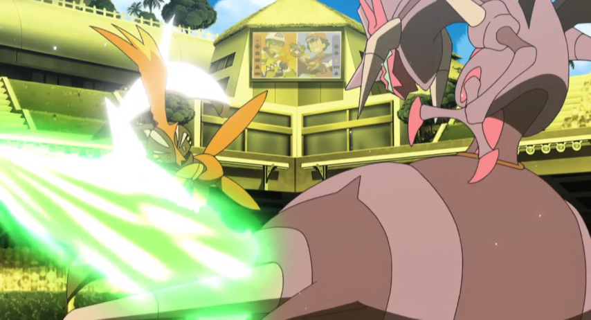 verhindern. Mit Ruckzuckhieb schafft es Ashs Pokémon, einen weiteren, überraschenden Treffer zu landen. Durch den erneuten