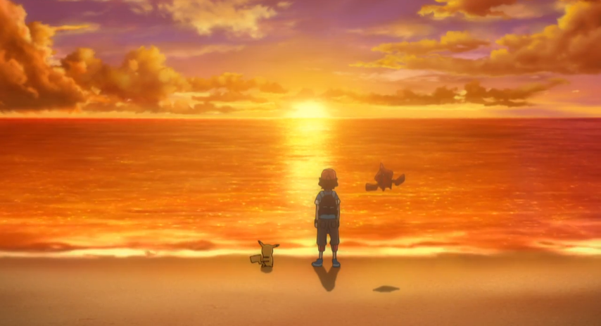Sonnenuntergang in Alola. Auf die Nachfrage von Rotom, wann es Ash seinen Freunden