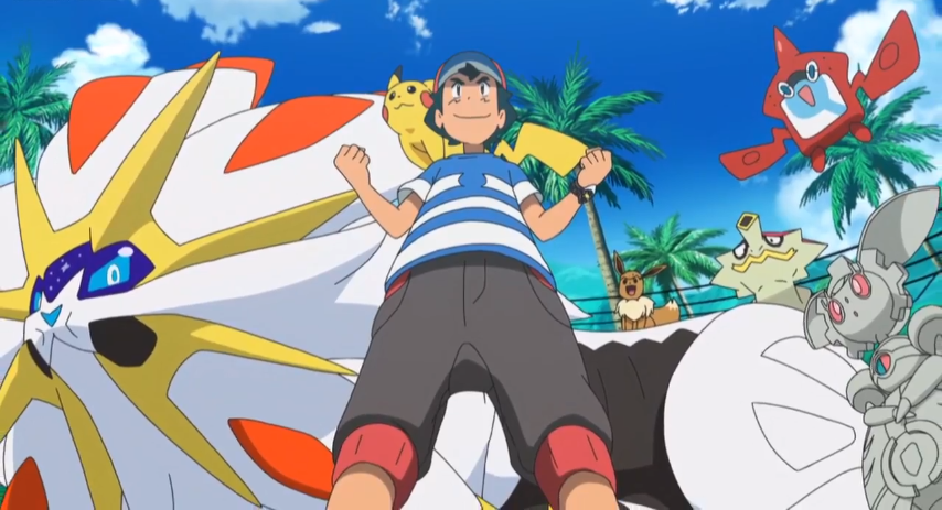 Gemeinsam mit dem Rotom-Pokédex und Pikachu ist Ash am Strand und genießt den