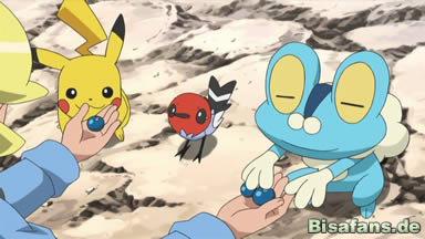So machen sich die drei zusammen mit Froxy und Pikachu auf den Weg. Doch kaum sind sie auf der Route, da hören die beiden Pokémon schon etwas und bleiben stehen. Natürlich tun es die Kinder ihnen gleich, als eine Beere aus einem Baum gefallen kommt. Pikachu will diese aufheben, doch mit einem Funken wird sie von ihm weg und direkt auf Heurekas Nase befördert. Doch bevor Heureka anfangen kann zu weinen, zeigt sich auch schon der vermeintliche Besitzer der Beere: Ein Dedenne. Heureka ist hin und weg von dem niedlichen Pokémon und will es behalten, was Citro ihr schließlich erlaubt. So will Heureka das hamsterähnliche Pokémon mit der Beere anlocken, als diese von einem Vogelpokémon – Dartiri – geklaut wird. Dedenne ist verzweifelt und rennt weg, was Heureka wiederum zum Weinen bringt. Ash will Dartiri fangen und, da es einen Typenvorteil hat, Pikachu einsetzen, doch bevor Pikachu angreifen kann, greift Froxy schon das Flugpokémon an und gibt Pikachu zu verstehen, dass dies sein Kampf ist. Dabei ist es jedoch stark im Nachteil, da es nicht fliegen kann und Dartiri somit viel wendiger ist, als es selbst.