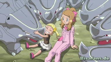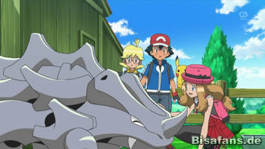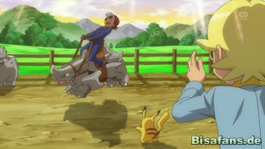 Bald fangen sie jedoch mit dem Training für Ash an. Serena zeigt ihm zuerst, wie man auf ein Rihorn aufsteigt, da man dafür eine bestimmte Platte des Rihorns als Hilfe benutzen kann. Doch wie sich herausstellt, ist dies schwieriger, als es sich anhört und Ash landet einige Male unsanft auf dem Boden. Er bittet schließlich Serena es ihm zu zeigen, was sie auch etwas zurückhaltend tut. Doch das Rihorn lässt sie problemlos aufsteigen und auch ein Stück reiten und gerade als sie sich sicher fühlt, nachdem das Rihorn zuhause sie immer abgeworfen hat, fängt auch dieses Rihorn an zu bocken und wirft sie ab. Sofort laufen alle anderen Rihorn auf sie zu und umgeben sie ganz, so dass Ash und die Geschwister schon Angst um sie haben. Doch es stellt sich heraus, dass die Rihorn Serena nur ablecken, da sie das Mädchen offenbar mögen. Heureka ist davon begeistert und läuft auch zu den Rihorn dazu.