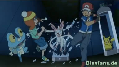 Das tun sie natürlich und die Bälle, die eigentlich Rauchbomben waren, gehen in die Luft. Ash und seine Freunde evakuieren die Kinder, doch gerade als auch das letzte von der Bühne gestiegen ist, fängt ein Energienetz Pikachu und Feelinara, die genau wie Ash, noch oben stehen. Ash wird zurückgeschleudert, der Lastwagen schließt sich und fährt von dannen.