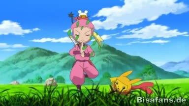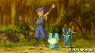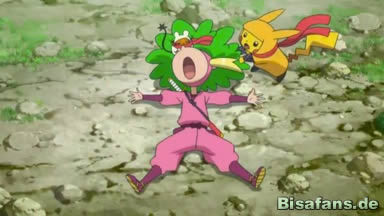 Während sie zu Mittag essen erzählt ihnen Sanpei von dem Ninjadorf, aus dem er kommt und von seinen beiden älteren Brüdern, die jeweils ein Quajutsu und ein Bisaflor benutzen und als die stärksten Ninja des Dorfes gelten. Sanpeis Ziel ist es jedoch die beiden zu übertreffen – zumindest als Pokémontrainer.