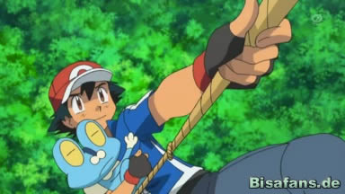 Nach dem Essen trainieren sie weiter – dieses Mal, indem sie von Baum zu Baum springen, wobei Ash zuerst beinahe herunterfällt, es dann jedoch schafft, wenngleich er bei weitem nicht so grazil ist, wie die Pokémon oder Sanpei. Schließlich jedoch verliert er das Gleichgewicht und fällt beinahe, wird aber von Sanpei gerettet.