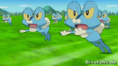 Dann zeigt Sanpei ihnen, dass wie Amphizel seine Geschwindigkeit nutzen kann um über das Wasser laufen zu können. Als Froxy dies versucht scheitert es kläglich, doch da es in Sanpeis Amphizel, das sich ihm gegenüber sehr überheblich verhält, einen Rivalen gefunden hat, versucht es dies solange, bis es es schließlich ebenfalls schafft, eine kleine Insel auf einem See zu erreichen.