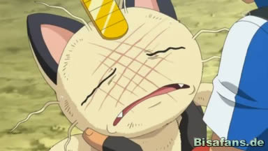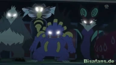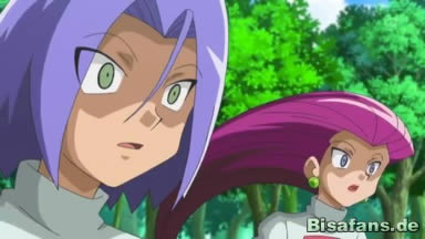 Auch Team Rocket hat sich retten können und Jessie und James sind entrüstet, dass sie sich haben kontrollieren lassen, als sie entsetzt erkennen, dass sich Iscalar in Calamanero weiterentwickeln kann. Dieses grinst aber nur.