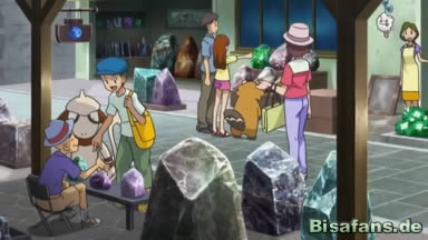 In der Stadt rätseln alle, wo sich der Lucarionit befindet, da Connie nur annahm, ihn schnell finden zu können. Da in den Läden viele Entwicklungssteine verkauft werden und die Freunde auch Zeugen einer Entwicklung eines Eguana zu einem Elezard beobachten können, fragen alle in den Läden, finden aber nichts, da niemand den Stein kennt. Daher nehmen sie an, dass der Lucarionit extrem selten ist.