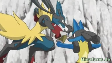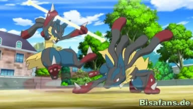 Schließlich wird Pikachu von Power-Punch getroffen und gegen einen Stein geschleudert. Es kann aber mit Elektroball angreifen, doch Mega-Lucario greift an und setzt Power-Punch ein. Nun bemerken die Trainer, dass etwas mit Mega-Lucario nicht stimmt, als es Pikachus Schweif mit den Zähnen packt und umherwirbelt. Anschließend kicket es Pikachu mit einem Tritt weg und Ash läuft zu Pikachu.
