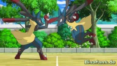 Beide Lucario entwickeln sich zu Mega-Lucario, bevor der Kampf beginnt und die Aura beider erzeugt Wind.