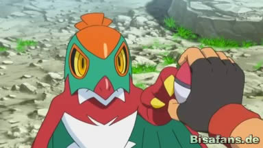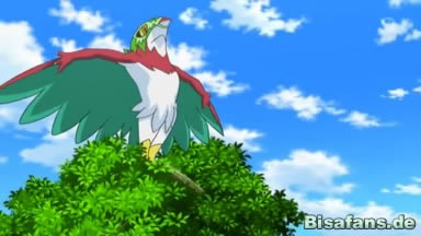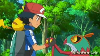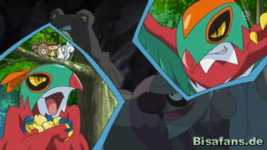 Heureka und Ash wollen den Pokémon helfen und das Ursaring dazu bringen, die Beeren zurückzugeben. Doch da springt plötzlich aus einem Baum ein Pokémon. Laut dem Pokédex handelt es sich um ein Resladero, doch sieht das wilde ein wenig anders als das im Pokédex aus. Es stellt sich heraus, dass es eine Maske aus Blättern trägt, die es dann aber abstreift.