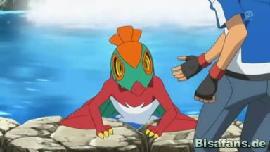 Am Wasserfall will Ash mit Froxy gegen Resladero kämpfen. Er startet mit Aquawelle, doch diesem Angriff kann Resladero ausweichen, ebenso einem nachfolgenden Blubber. Dann liefern sich die Pokémon ein Rennen den Wasserfall hinauf, bei dem Froxy ins Wasser fällt, während Resladero auf einen Baum springt.