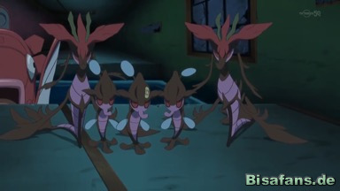 Auch Irrbis' Angriff kann abgehalten werden. In diesem Moment erscheinen auch die Trainer der Pokémon. Jessie regt sich darüber auf, dass die Freunde ihnen wieder in den Weg gekommen sind. Irrbis greift an, jedoch hat es wenige Chancen gegen Igamaro und Pam-Pam. Citro und Serena feuern ihre Pokémon an.