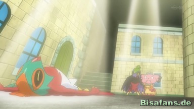 Schließlich kommt Galagladi aus dem Behandlungsraum, und Joy teilt mit, dass es in zwei oder drei Tagen wieder fit sein wird. Das betrübt Helmut, da das Pokémon somit nicht in der Super-Pokémon-Kampfshow am nächsten Tag mitspielen kann. Ash wird daher ebenfalls traurig, da er es als seine Schuld ansieht.