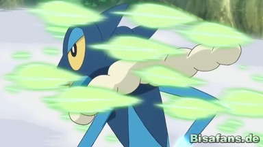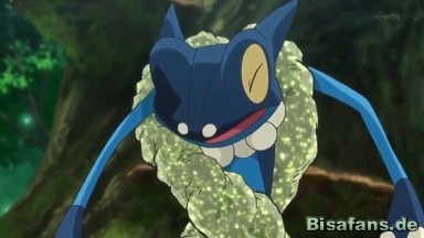 Anschließend greift Ultrigaria mit Rasierblatt an, doch Amphizel wehrt mit Aquawelle aus. Auch einem folgenden Giftpuder kann Amphizel entgehen, indem es sich eine Maske aus dem klebrigen Mousse um seinen Hals macht.