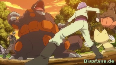 James, Mauzi und Irrbis entdecken inzwischen eine Falle und stoßen auch auf den Pokémon-Wilderer, der sie mit seinem Rihornior angreift, da er von Mauzi begeisert ist.