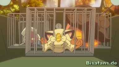 Durch einen riesigen Felsen, der im Kampf entstanden ist, sind Ash und die anderen vom Wilderer abgeschnitten, der nun James, der Mauzi und Iscalar bereits befreit hat, entdeckt. Gerade in diesem Moment wird aber ein Ast auf den Wilderer geworfen und Jessie stimmt das Rocket-Motto an. James und Mauzi versuchen, sie davon abzuhalten und sie zum Zurückgehen zu bringen, doch sie lässt sich nichts sagen, sodass die beiden schließlich vor Glück zu weinen beginnen.