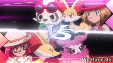 Durch Pam-Pams Angriff kommt Fynx nun in die Luft und kann mit Flammenwurf ungehindert angreifen. Auch Fennexis nutzt Flammenwurf. Fennexiss Angriff ist stärker. Beinahe besiegt liegt Fynx auf dem Boden. Ariellas Parfinesse will es angreifen, aber Pam-Pam stellt sich vor Fynx und greift auf Serenas Befehl mit Finsteraura an. Serena macht sich Sorgen, da sie nichts tun kann. Ihr fallen Ariellas Worte ein, dass sie lächeln soll. Mit fröhlichem Gesicht meint sie zu ihren Pokémon, dass alles in Ordnung sei und dass sie gewinnen würden, schließlich sind sie ihre Partner. Pam-Pam lächelt und auch Fynx steht mit einem Lächeln auf.