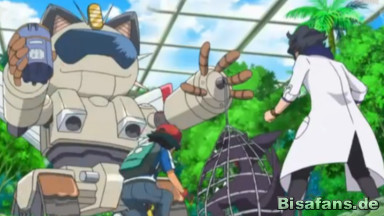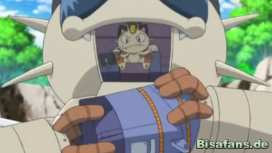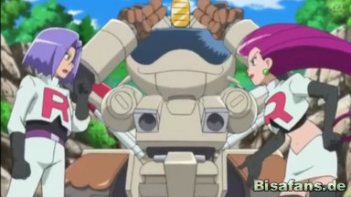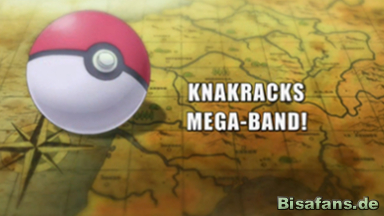 Der Synchronisator reagiert auf den Mega-Stein und teilt ihnen mit einem Diagramm mit, dass es sich um einen Knakracknit handelt. Wie es der Zufall will, hat Professor Platan sogar eines. Unsere Helden freuen sich schon darauf, die Mega-Entwicklung mit ihren eigenen Augen zu sehen, allerdings wird das Fenster plötzlich eingeschlagen und ein kolossaler Mauzi-Roboter von Team Rocket steht vor ihnen. Es will die Macht der Mega-Steine für sich nutzen und es gelingt dem Trio, den Stein mit den Roboterarmen zu entwenden. Darauf versucht Pikachu mit einem Donnerschock anzugreifen, wird aber weggestoßen, als Team Rocket ein Netz auf das Knakrack wirft, es fängt und anschließend davonfliegt.