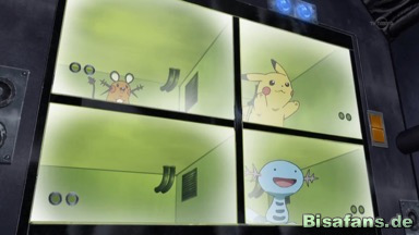 Durch Florges' Angriff werden die Pokémon Team Rockets gegen die Wand, hinter der Pikachu und die anderen eingeschlossen sind, geschleudert und lösen dabei den Schließmechanismus aus, sodass die drei Pokémon befreit werden.