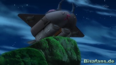 Inzwischen kommt Kenne zu Serena und Citro, die noch immer draußen kämpfen, als erneut die Erde bebt. Über der Höhle erhebt sich daraufhin eine riesige Flugmaschine in Form eines Mantax, die auch von Ash und Heureka gesehen wird, als sie die Höhle verlassen. Dort treffen sie sofort auf die anderen, denen die Ereignisse in aller Kürze erklärt werden.