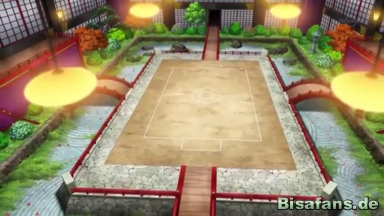 Als die Freunde die Arena betreten, werden sie von vier Angestellten begrüßt. Ash erklärt knapp, dass er einen Arenakampf möchte und wird von den Mädchen durch gelassen. Hinter der Treppe, welche sie überqueren, erwartet ein großes Kampffeld die Freunde, welches von einer hübschen Anlage umgeben ist.
