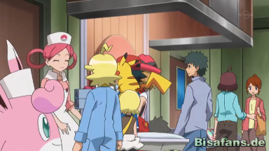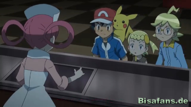 Währenddessen ist Ash fertig mit seiner Arbeit auf dem Dach. Er bemerkt, dass Heureka und Serena die Uniform der Joys tragen, damit sie besser erkannt werden. Schüchtern fragt Serena, wie er sie darin findet. Sie gefällt ihm.