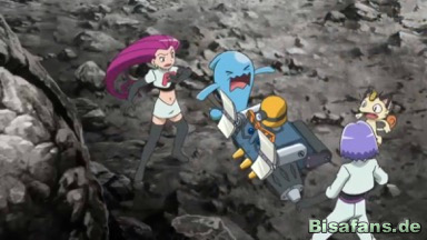 Die Erfindung sucht weiter nach dem Fels und entfernt sich von unseren Freunden, was Team Rocket ausnutzt, um Lavados zuerst zu finden. Die Maschine bleibt stehen und scannt wieder, was Team Rocket nicht weiß. Es denkt, dass sie kaputt ist und hält das Geräusch, das nun ertönt, um zu zeigen, dass der Fels gefunden wurde, für einen Alarm. Jessie tritt das Gerät, was es zur Explosion bringt. Dies hören Ash und seine Freunde und rennen in Richtung der Rauchwolke. Dort sehen sie die kaputte Erfindung, die nun auf sie zufährt und sie verfolgt, ehe sie in die Magma stürzt und nun endgültig funktionsuntüchtig ist.