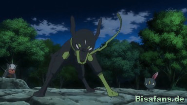 Eine von grünlich schimmerndem Wasser erleuchtete Höhle bebt und es fallen Steine ins Wasser, weshalb aus diesem ein Zygarde auftaucht. Dieses lässt einen Kampfschrei los, weil es von Team Flare unter der Führung von Magnolia angegriffen wird. Letzte befiehlt nun, dass der Fang begonnen werden soll, weshalb ein Hundemon, ein Pionskora und ein Sniebel angreifen.
