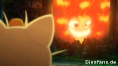 Am Ende des Weges wartet das Feuerwesen erneut. Blobby weist Pikachu und Mauzi an, zu kämpfen, Mauzi sträubt sich jedoch.