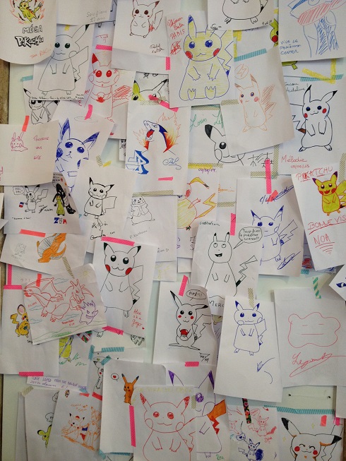 Auf einem TV lief ein kurzer Clip, in dem Chef-Designer Ken Sugimori von Game Freak erklärte, wie man am besten ein Pikachu zeichnet. Somit konnten Fans ihren eigenen Entwurf kreieren und diesen an einer Säule aufhängen, die von Fanarts vorheriger Besucher bereits reichlich geschmückt wurde.