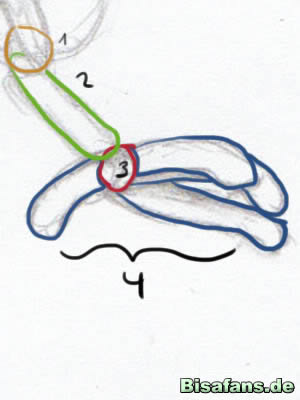 rechts unten verläuft (2). Leicht überschneidend kommt daran wieder