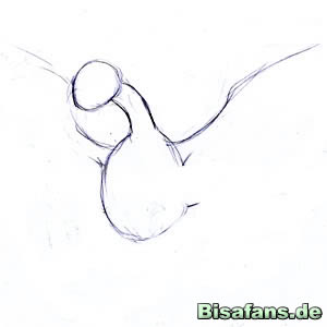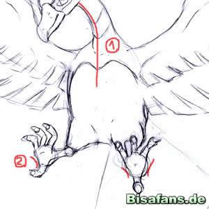 Denkt euch wieder an Ho-Oh’s Hals entlang eine imaginäre Linie, nur diesmal vorne am Köper bis zum Bauch - ihr könnt diese auch leicht einzeichnen. Die Linie ist für euch eine gute Orientierung für das Hals- und Bauchgefieder - es soll ja schön mittig sein! ^^ Ihr könnt nun die einzelnen Krallen direkt miteinander verbinden (siehe Bild) und die überstehenden Kreisreste wegradieren.