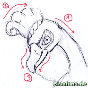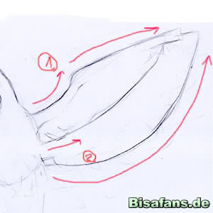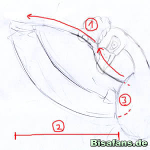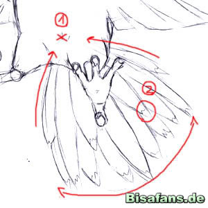 Am besten ihr skizziert euch erstmal die gedachten Relationen vor. Hier kann man sich einfach vorstellen, dass Ho-Oh 2 Flügel hat, einmal die kleinen “Stummelflügel” (siehe 1) und zum Anderen die “Erweiterung” (siehe 2), welche unter den anderen Flügeln liegt. Hier steht euch wieder völlig frei, was für eine Spannweite Ho-Oh’s Flügel haben, ihr dürft also entscheiden wie kurz oder lang sie sind. Hier könnt ihr eine leichte Kurve nach oben machen, welche anschließend wieder leicht nach rechts geht. Das sollen Ho-Oh Gelenke darstellen, nur leider wird Ho-Oh oft mit (meiner Meinung nach) recht mickrigen Gelenken gezeichnet - mehr dazu weiter unten.Die obere Linie wird die untere Grenze des einen Flügels und die untere Linie gehört zum anderen Flügel, am Ende sollen beide Linien bogenförmig mit der Obersten zusammenlaufen. Das hört sich jetzt vielleicht kompliziert an, orientiert euch einfach am Bild.