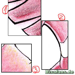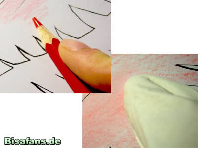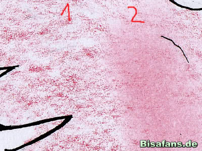 Ihr solltet euch als erstes für eine Farbe entscheiden (ich habe mit rot angefangen) und mit ihr die jeweiligen Stellen leicht schraffieren (siehe Bild, links) - schraffiert möglichst gleichmäßig. Seid ihr damit fertig, “spannt” ihr euch ein Taschentuch über den Finger und fangt an, die Farbe zu verwischen (siehe Bild, rechts). Hier, zum direkten Vergleich. 1 ist nur schraffiert und die 2 ist zusätzlich verwischt: