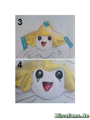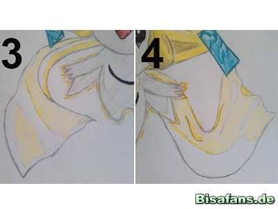 - Schattenzonen skizziert ihr leicht mit Bleistift und malt danach mit Gelb darüber. Auf das Gelb kommt sozusagen "Schatten im Schatten". Also nehmt einen goldenen und einen orangenen Holzstift und zeichnet auf das Gelb in der Schattenzone.