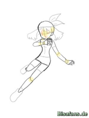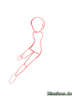 - Nun kommen die Beine: (sind übrigens genauso aufgebaut wie die Arme bzgl. des Zeichnens) die Beine könnt ihr theoretisch als zwei abgeflachte NUllen sehen, die sich einmal von Hüfte zu Knie, und vom Knie aus zu den Füßen, erstrecken. Stellt euch immer vor, eure Zeichnung wäre eine Gliederpuppe: "ein Gelenk muss sauber in das andere übergehen, sonst kann sich die Puppe nach Fertigstellung nicht bewegen"