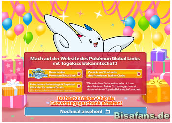 Fans können ein besonders seltenes Togekiss auf Level 10 mit der besonderen Fähigkeit Glückspilz erhalten, wenn man im Monat des eigenen Geburtstages bei Global Link vorbeischaut. Voraussetzung ist eine Registrierung bei Global Link mit wahlweise einer Weißen oder Schwarzen Edition. Das Geburtstags-Togekiss ist seit dem weltweit erhältlich. Hinweis: Fans, die im Juni 2012 Geburtstag haben, können ihr Togekiss bereits im Mai 2012 abholen, da im Juni vom 05.- ein langes Wartungs-Update stattfindet!
