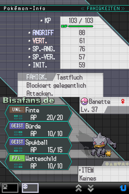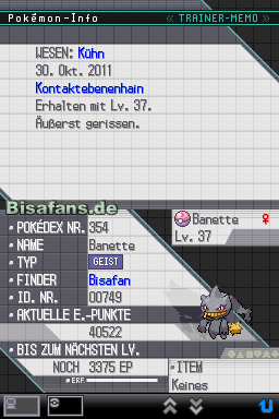 Nach der Eingabe des Passworts folgt ein kleines Suchspiel, bevor Banette auf den DreamWorld Account übertragen wird. Mit der nächsten Spielsynchro wird Banette dann auf den Spielstand von Pokémon Schwarz/Weiß übertragen und kann in der Kontaktebene abgeholt werden. Falls man auch bei der Traumeiche ein Pokémon erhalten haben sollte und beide mit einem Traumball fangen will, sollte man nach dem Fangen des ersten Pokémon in der Kontaktebene diese verlassen und erneut betreten. Dann bekommt man erneut einen Traumball ;)