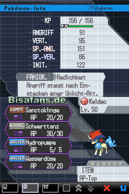 beherrscht diesmal die Attacken Sanctoklinge, Schwerttanz, Hydropumpe