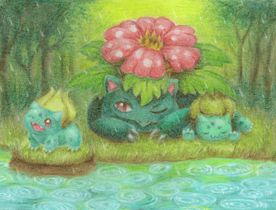 Bisaflor harrte inmitten des Regens standhaft aus. Unter den ausgebreiteten Blütenblättern auf seinem Rücken hatten es sich mehrere Pokémon gemütlich gemacht, um Schutz vor dem Niederschlag zu suchen. Als die Tropfen weniger wurden und nur noch feiner Niesel zu Boden ging, trauten sich die jungen Pokémon wieder hervor. Bisaflor bedachte alle mit einem zufriedenen Blick, bevor sein Trainer, bewaffnet mit einem Schirm, auftauchte. Er sog die Luft ein und lächelte glücklich.