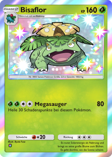 - RB Dieses Pokémon folgt der Sonne. Die Pflanze auf seinem Rücken absorbiert Solarenergie.