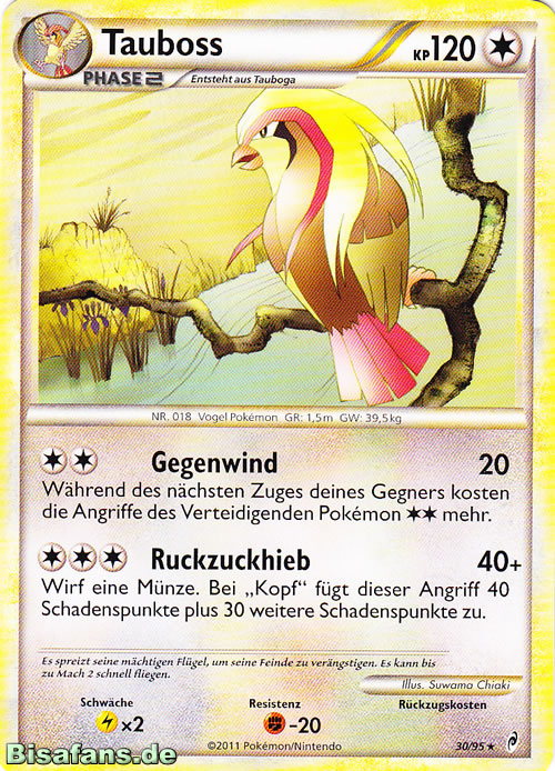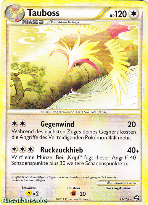 - RSS Dieses POKéMON hat ein wunderschönes, glänzendes Gefieder. Viele TRAINER sind von der Pracht des Gefieders begeistert, so dass sie TAUBOSS als ihr PKMN wählen.