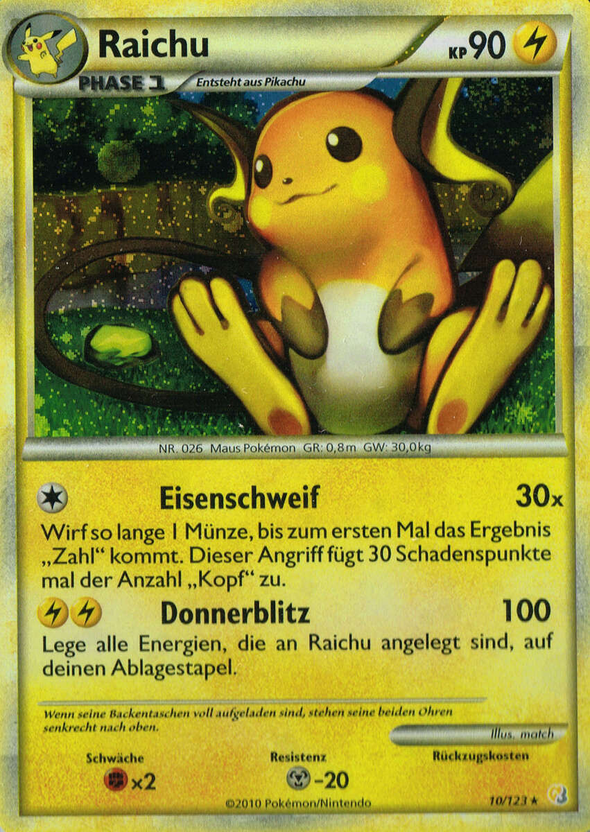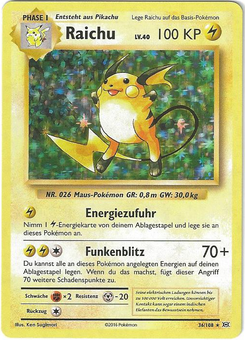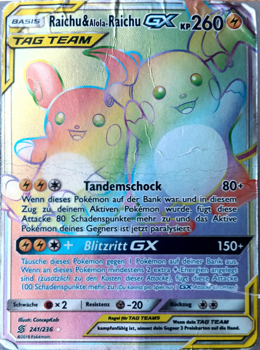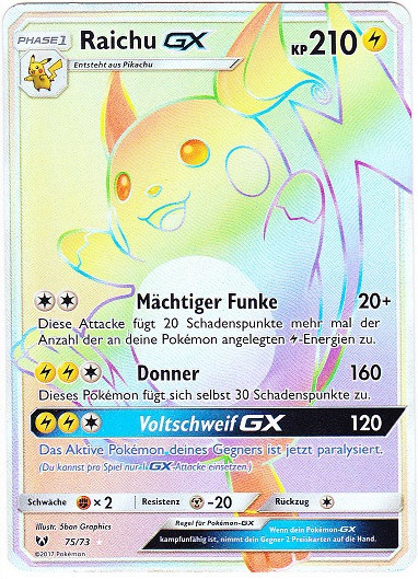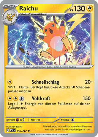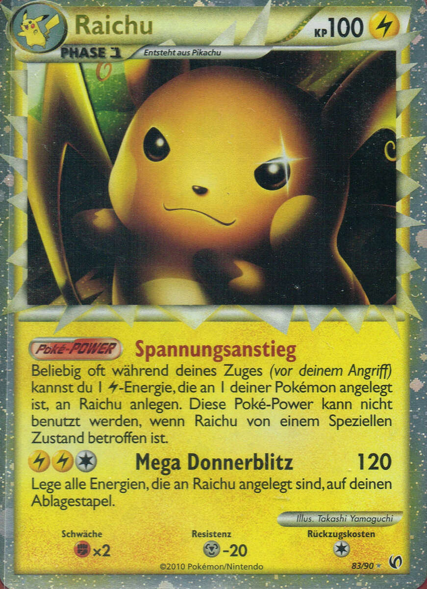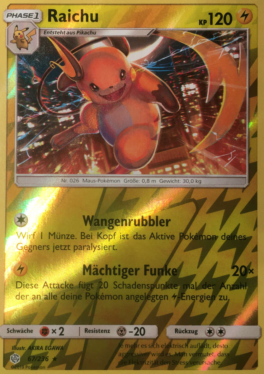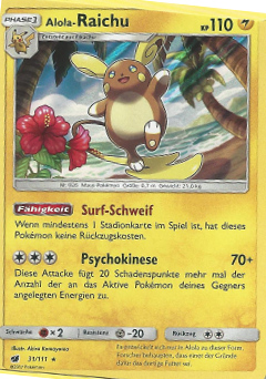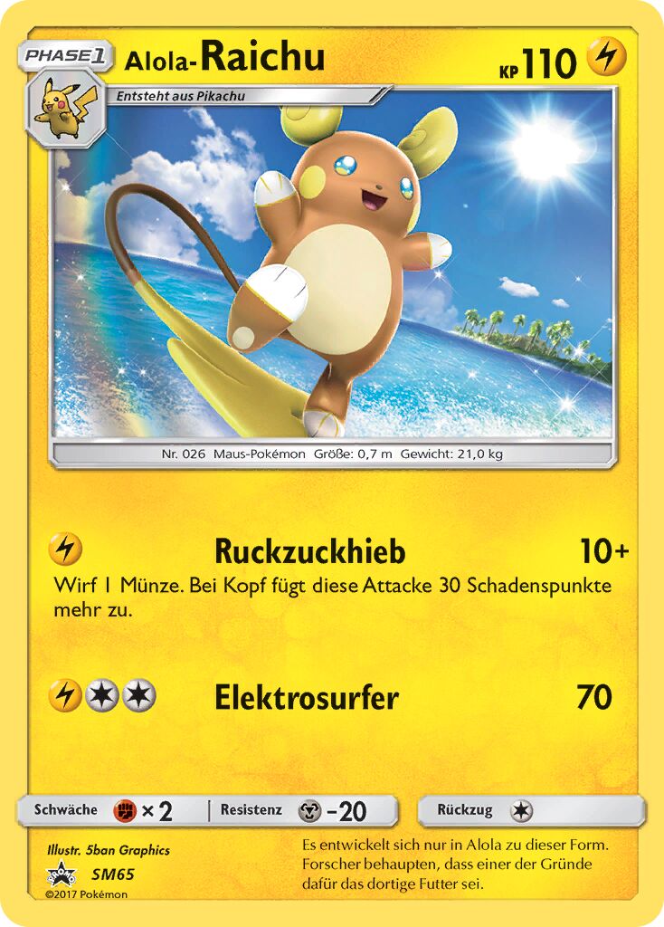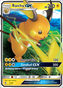 Sehr schnell, stark im Eröffnen von Kämpfen und teilt aus, wenn das richtige Terrain aktiv ist. Das A-Raichunium Z ermöglicht Raichu einmalig den Einsatz von Blitz-Wellenritt, welcher genauso stark wie ein regulärer Z-Donnerblitz ist, aber zusätzlich den getroffenen Gegner paralysiert. Alternativ sind auch Psium Z, Leben-Orb oder Fokusgurt spielbar. Die Wahl des Items und Psycho-STABs ist abhängig vom Team und persönlicher Präferenz. Mogelhieb als Support, Zugabe zum Bestrafen von unüberlegtem Setup und Schutzschild, Voltwechsel zum Scouten. Aufgrund der Synergie ist auch eine Kombination aus Mogelhieb und Voltwechsel möglich, durch den Verzicht auf Donnerblitz hat man so allerdings eine Einbuße an Power und wenn man unbedingt dennoch die Elektro-Z-Attacke braucht, muss man auf das Voltium Z zurückgreifen.