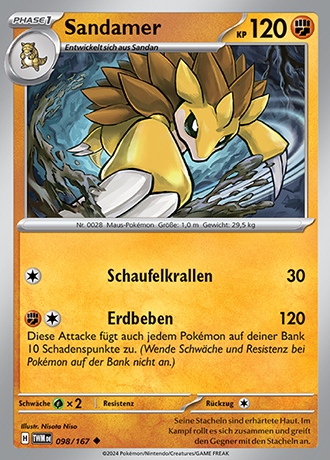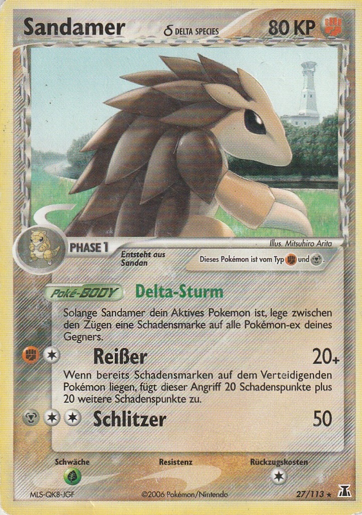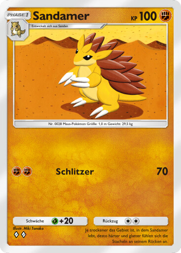- S SANDAMER kann sich zu einem Ball mit langen Stacheln zusammenrollen. Im Kampf schlägt es seine Gegner in die Flucht, indem es sie mit seinen Stacheln sticht. Dann springt es sie an und schlägt mit seinen scharfen Klauen zu.