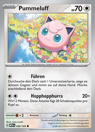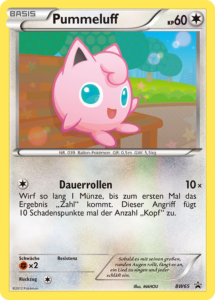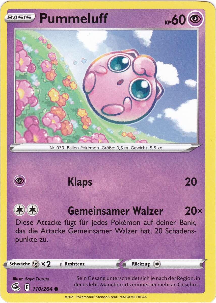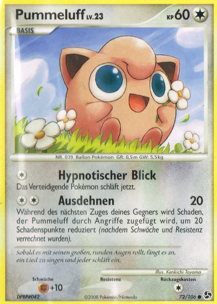 - S Wenn dieses Pokémon singt, hört es nicht auf zu atmen. Im Kampf gegen einen Gegner, der nicht so leicht in Schlaf zu versetzen ist, kann Pummeluff nicht atmen. Leider gefährdet es sich dadurch selbst.