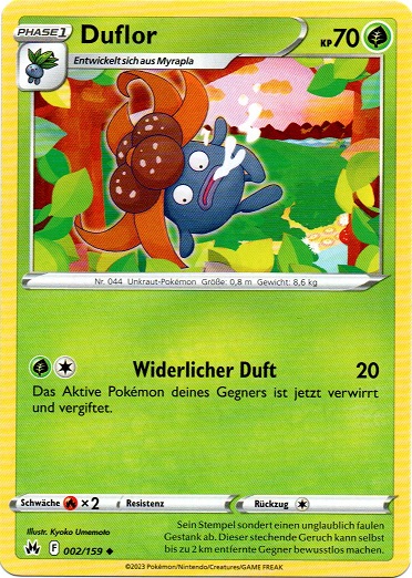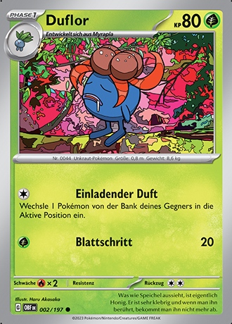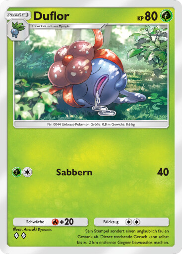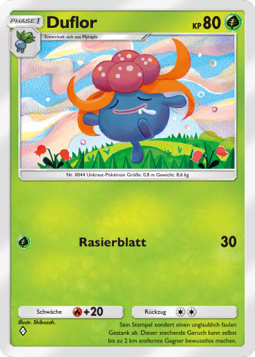 - OR Duflor produziert einen ekelerregenden Gestank aus dem Stempel seiner Blume. Wenn es in Gefahr gerät, wird der Gestank noch unerträglicher. Wenn sich dieses Pokémon in Sicherheit befindet, stößt es keinen Gestank aus.