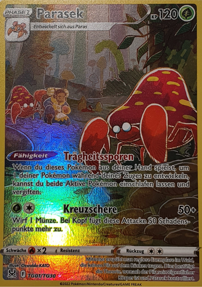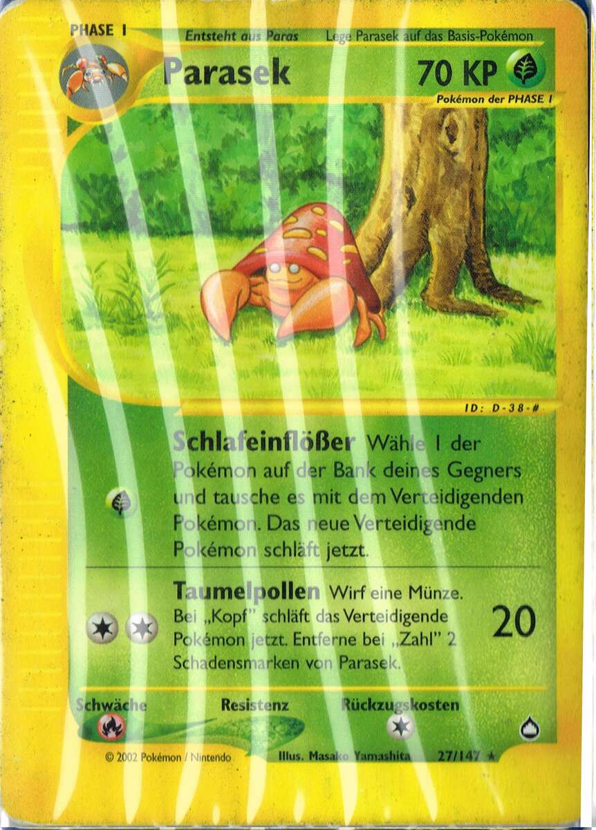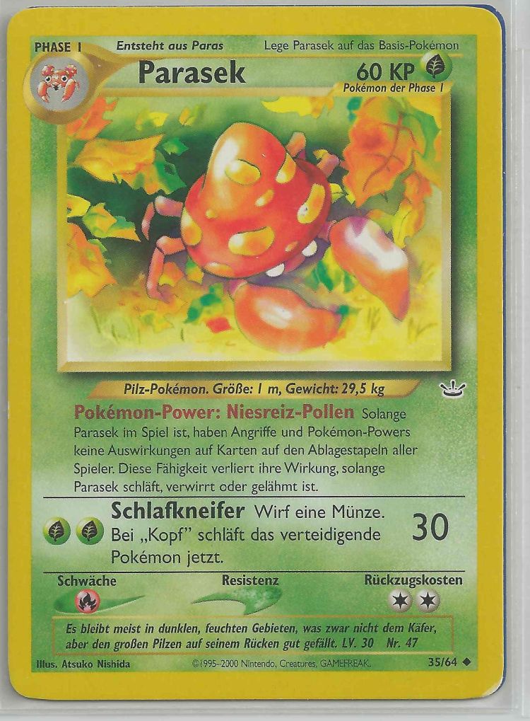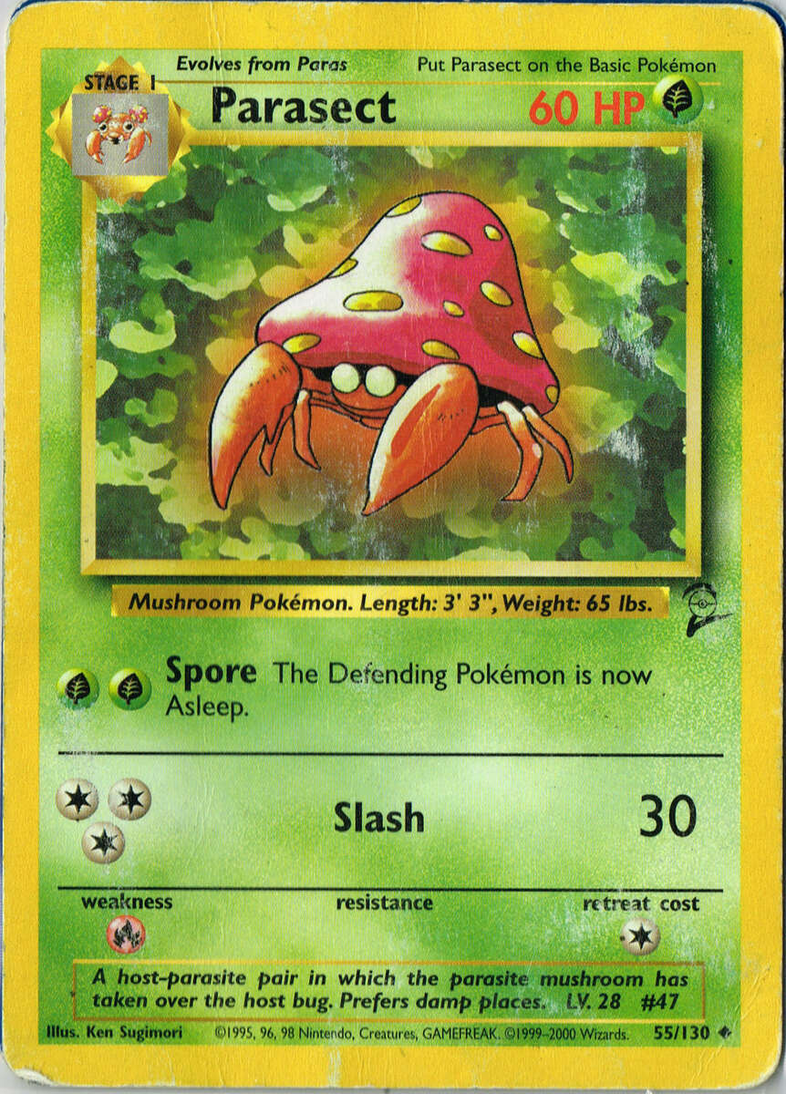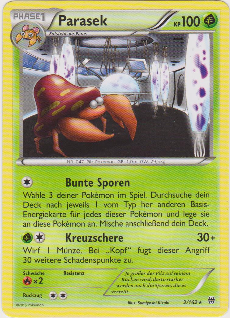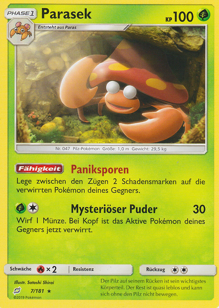 - SW Parasek wird von einem Pilz, der größer als das Pokémon ist, kontrolliert. Er gibt Giftsporen ab.