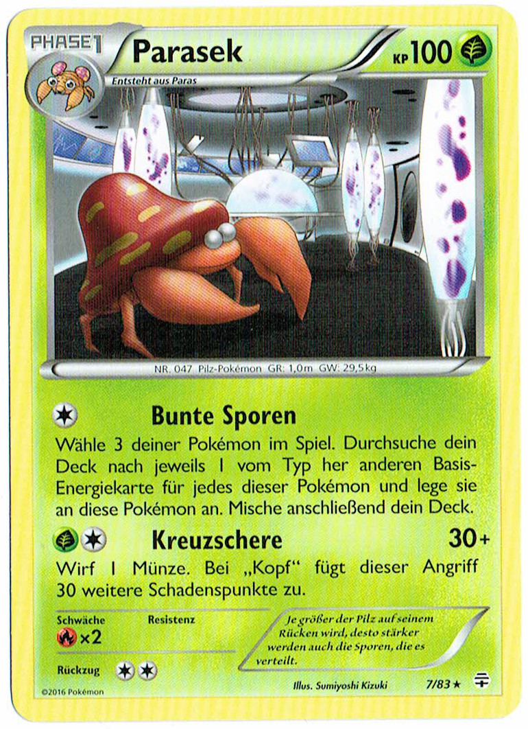 - X Parasek wird von einem Pilz, der größer als das Pokémon ist, kontrolliert. Er gibt Giftsporen ab.