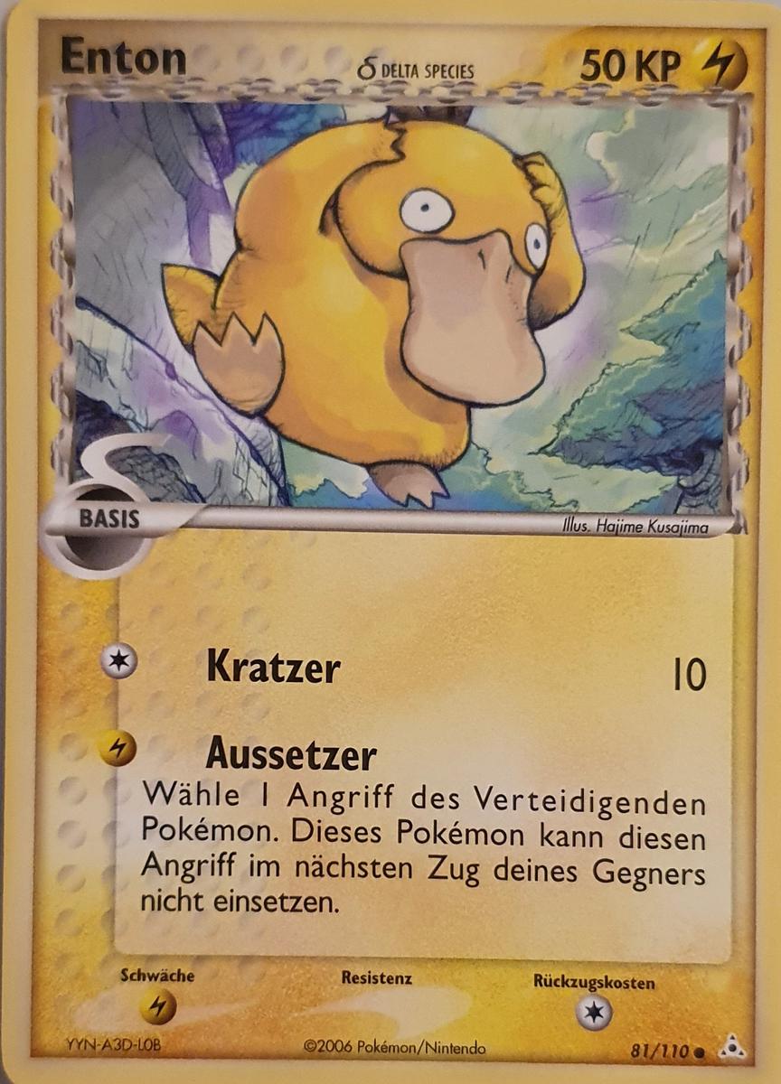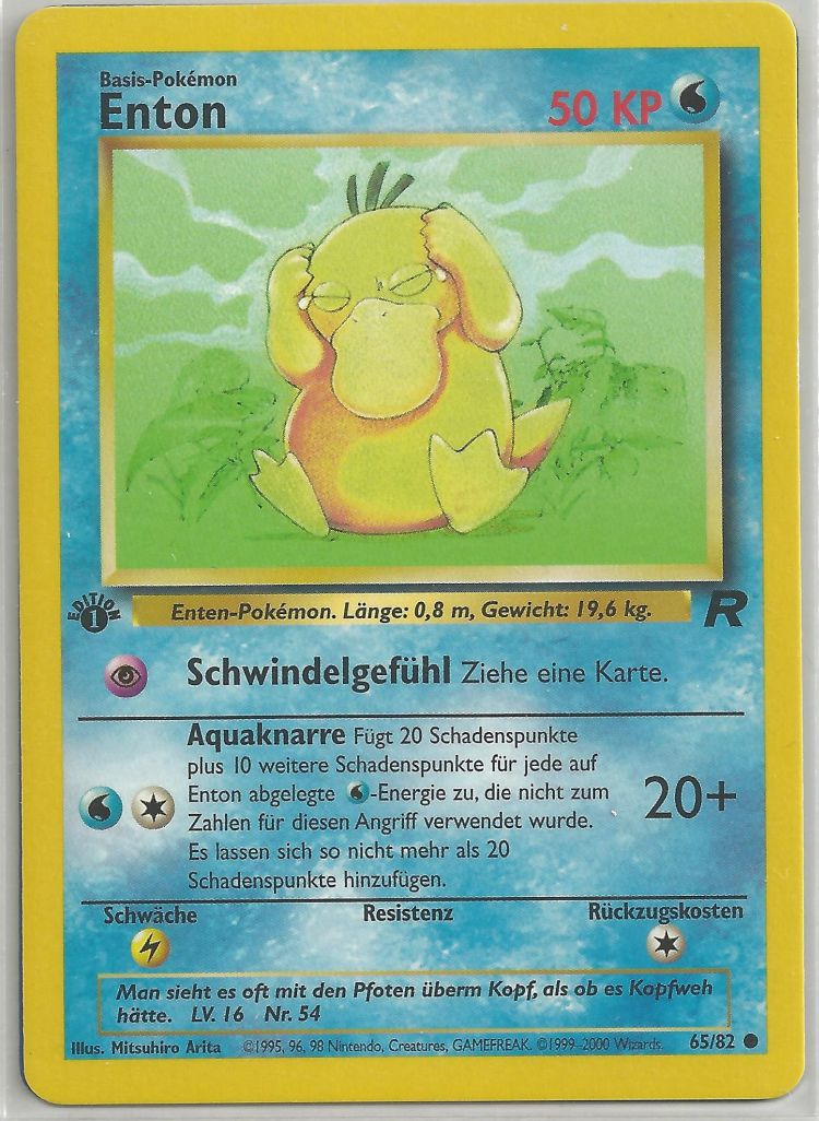 - Das am häufigsten auf Pokémon World Championships-Promokarten abgebildete Pokemon ist Enton. Seit 2004 gibt es für die Teilnehmer der Weltmeisterschaften traditionell besondere Promokarten in verschiedenen Sprachen. Auf jeder davon kann in irgendeiner Form ein Enton im Artwork gefunden werden.